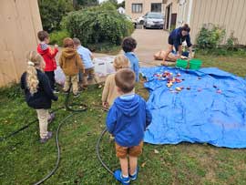 Students were out on a nature walk and collecting things to make a collage, but it just so happened that it was perfect time for when Mrs. Katers and Ms. Gencheff were harvesting things in the school garden! Mrs. Katers graciously took the kids on a tour of the gardens, pointing out all the different plants. She showed us that potatoes grow in the ground and where she digs them up. She even let the kiddos pick some flowers, and they got to smell and taste basil and mint. It was an unexpected, unplanned, wonder-filled encounter!